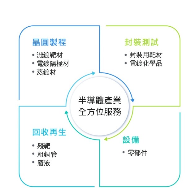 - 創鉅提供半導體製程(包含前段晶圓製程、後段封裝製程)中所需的各式功能性材料,包含濺鍍靶材、蒸鍍材、電化學沉積陽極材、電鍍化學品以及設備零件耗材。
